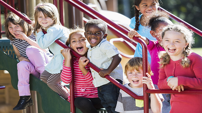Big group of multi-ethnic children on a sunny playground Previous Next Published April 18, 2019 at 800 × 450 in Family and Community Resources A big group of eight happy multiracial children sitting and standing together on the steps of playground equipment. There are six girls and two boys of mixed ages from 2 to 8 years old, and of diverse ethnicities, shouting, laughing and smiling.